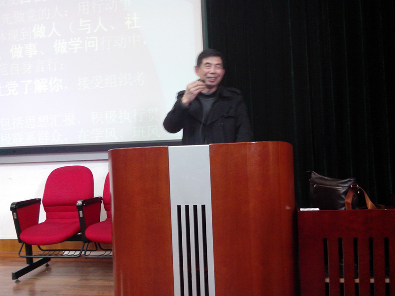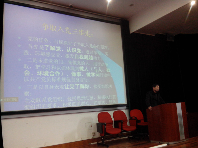 讲座中,施老师不仅为深入剖析了党的性质,而且为入党积极分子们分析了中国共产党的执政现状。他提出,当前中国共产党面临的四个重大考验:执政权力考验,改革开放考验,市场经济考验和外部环境考验。而这些归根结底,就是对党员思想信念的考验。同时,施老师也在讲座中为分析了中国的国情,并将中国与美国俄罗斯中东等国家地区做比较,通过比较,指出了中国共产党所具备的与时俱进的先进性。施老师在最后讲道:“只有坚持中国共产党的唯一领导,才是正确的选择。在中国的发展过程中,党用最有效率的方法手段克服了探索社会主义道路时所遇到的艰难曲折,使中国迅速发展繁荣了起来。
