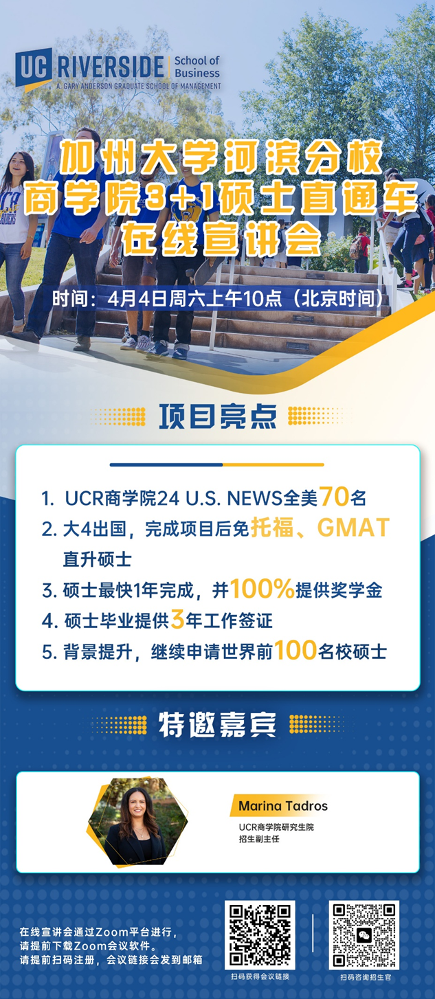 加州大学河滨分校(UCR)商学院 3+1+X 本升硕项目 线上宣讲会