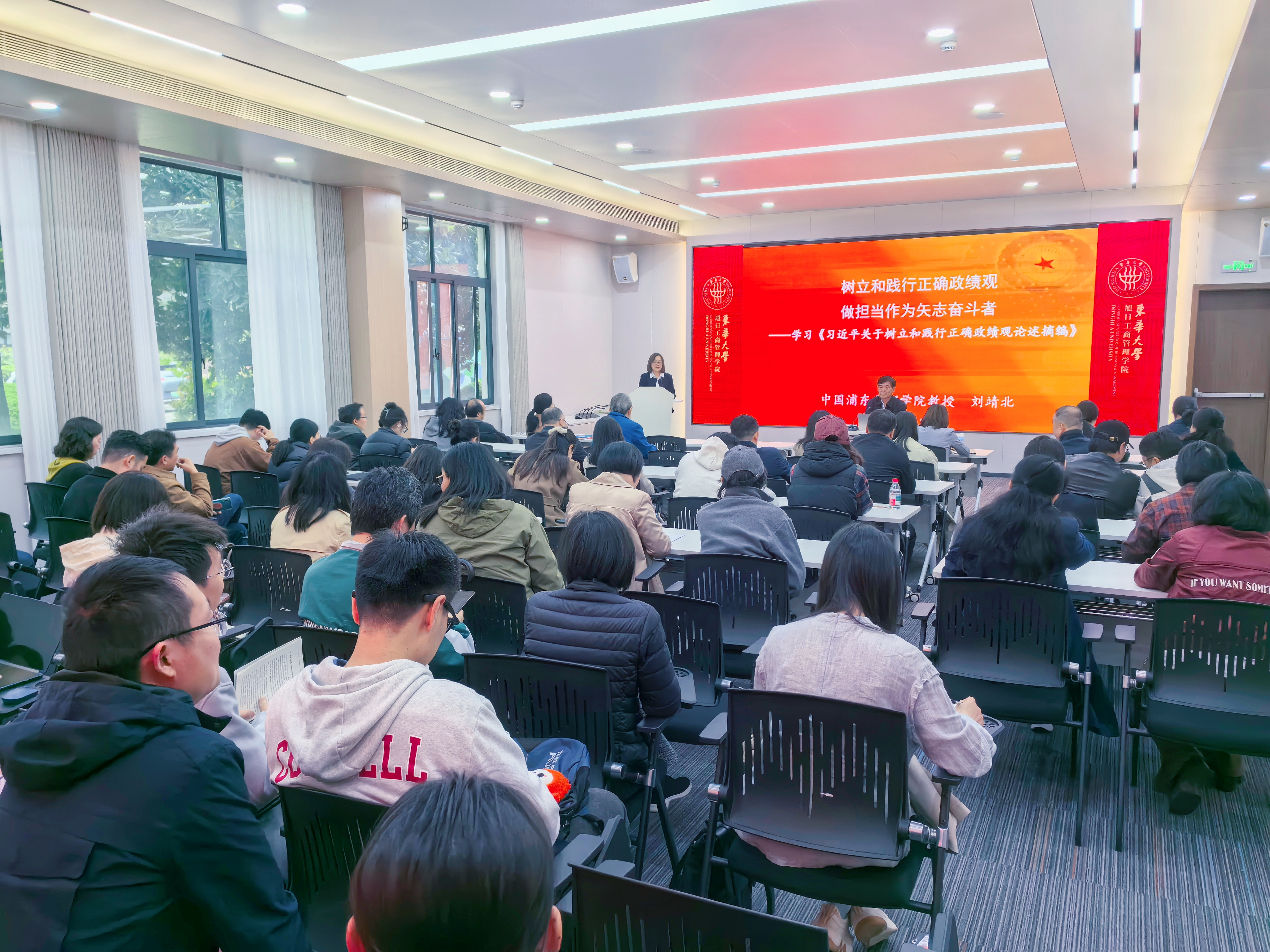 4月14日,管理学院在旭日楼100报告厅举办树立和践行正确政绩观学习教育专题辅导报告会,邀请中国浦东干部学院原副院长、一级巡视员刘靖北教授作《树立和践行正确政绩观,做担当作为的奋斗者》辅导报告。管理学院党政领导班子成员、教师党员参加学习。